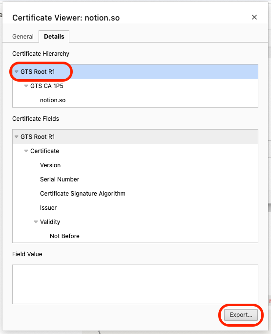 - Chrome: Open the Details tab. Firefox: Select the GTS Root R1 certificate.