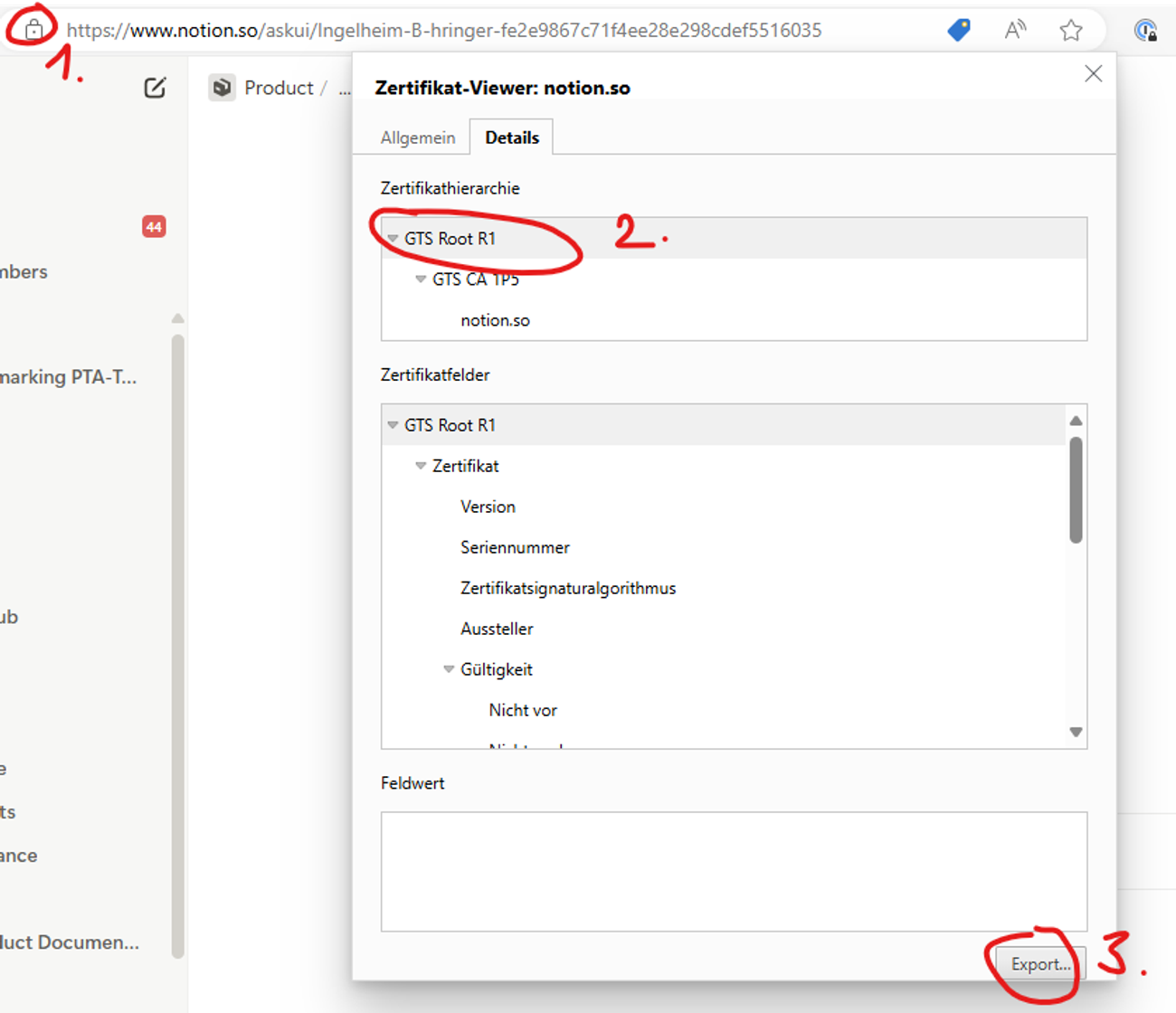 - Chrome: Select the Certificate GTS Root R1 and click Export… on the bottom right. Firefox: Under Miscellaneous, you can download the certificate.